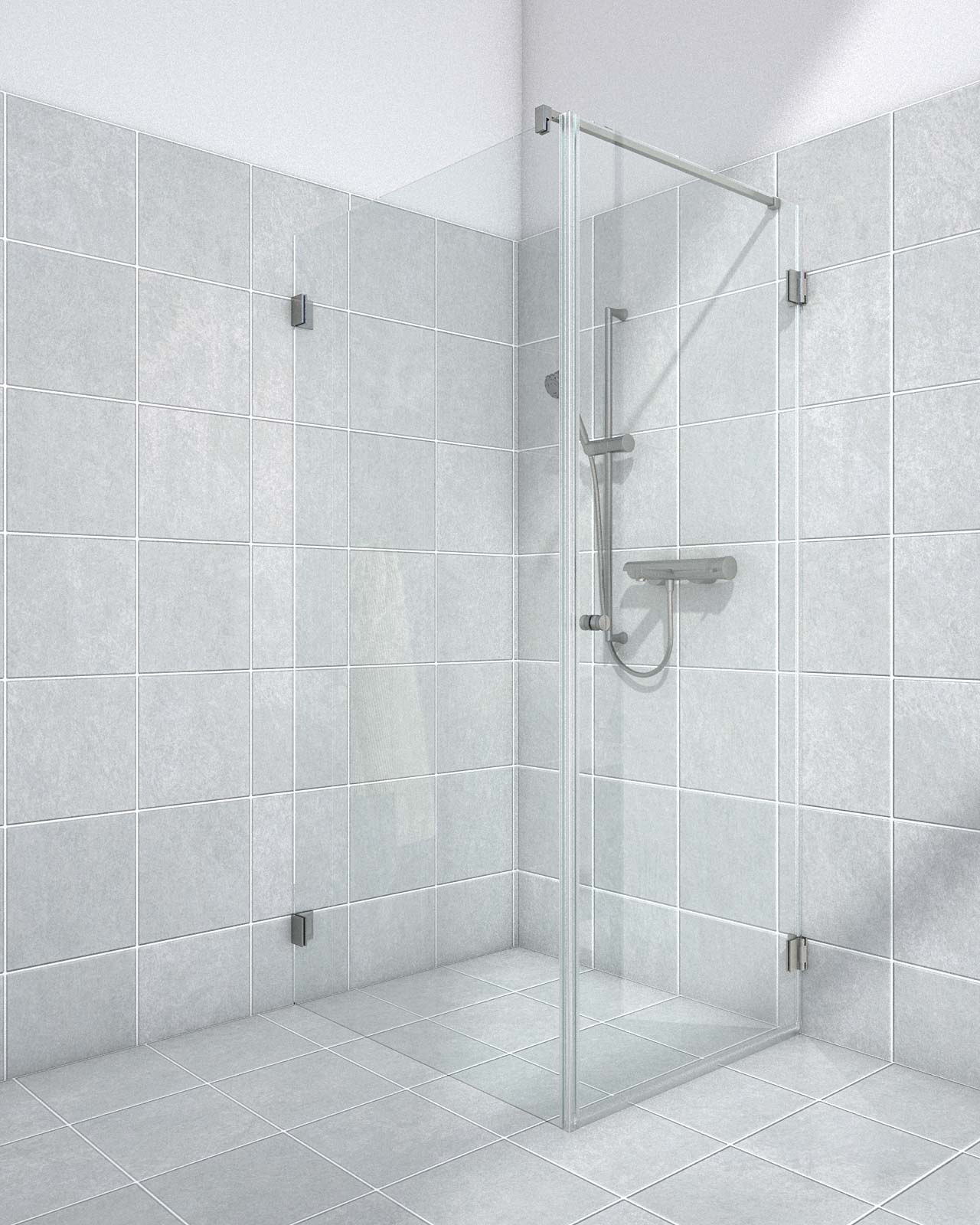 Eckdusche 2-teilig mit außenöffnender Tür an Wand. Rahmenlose Ausführung in hochwertigem 8mm ESG, Beschläge aus Messing und Edelstahl.